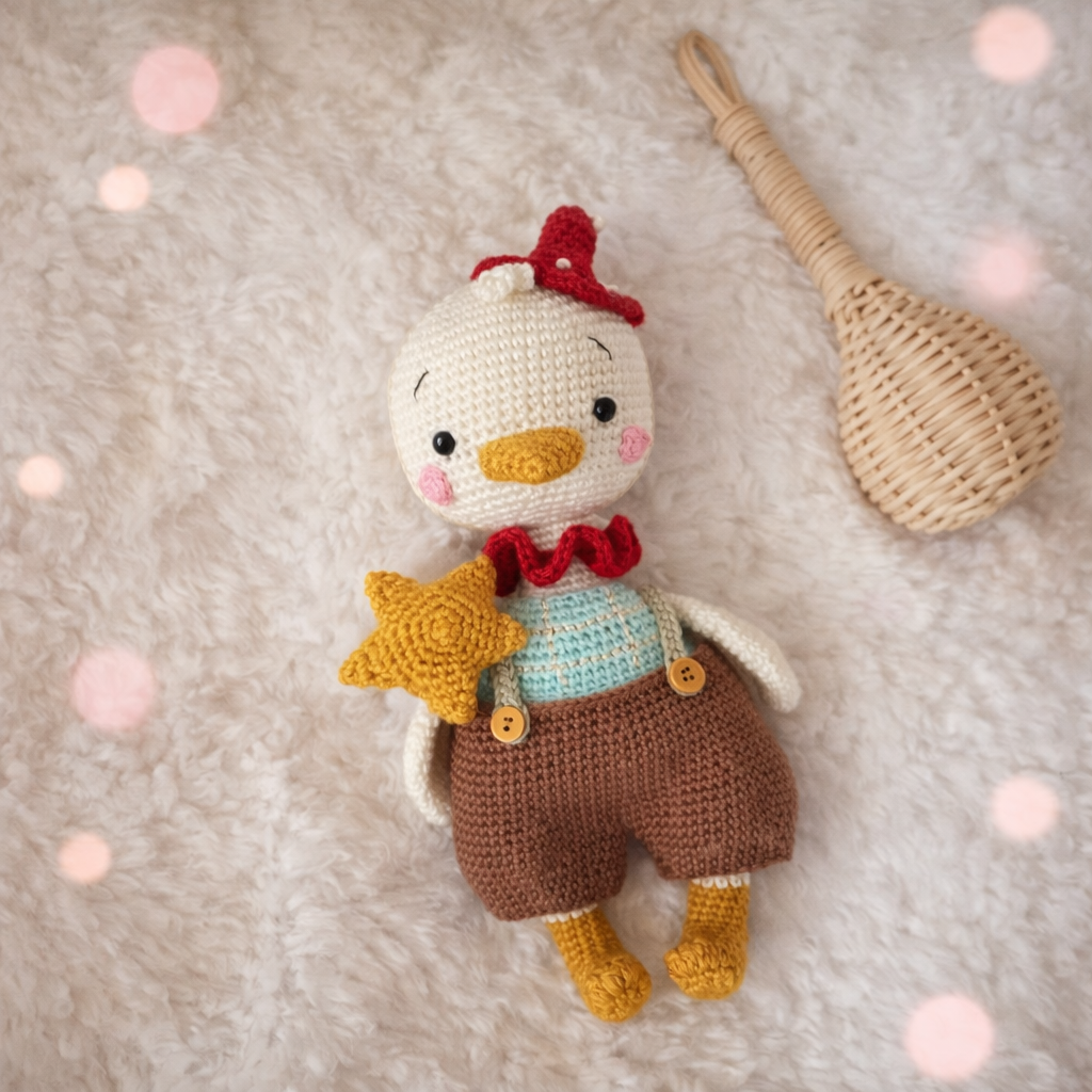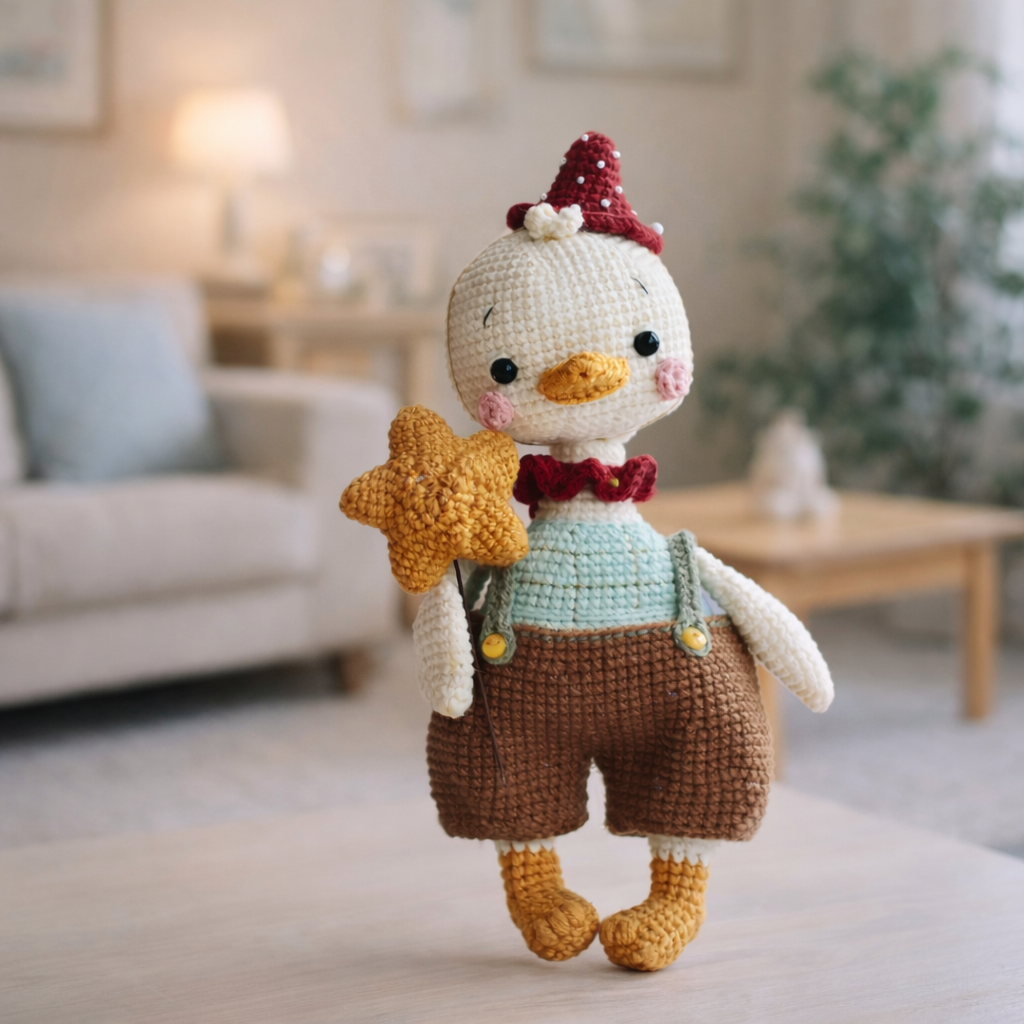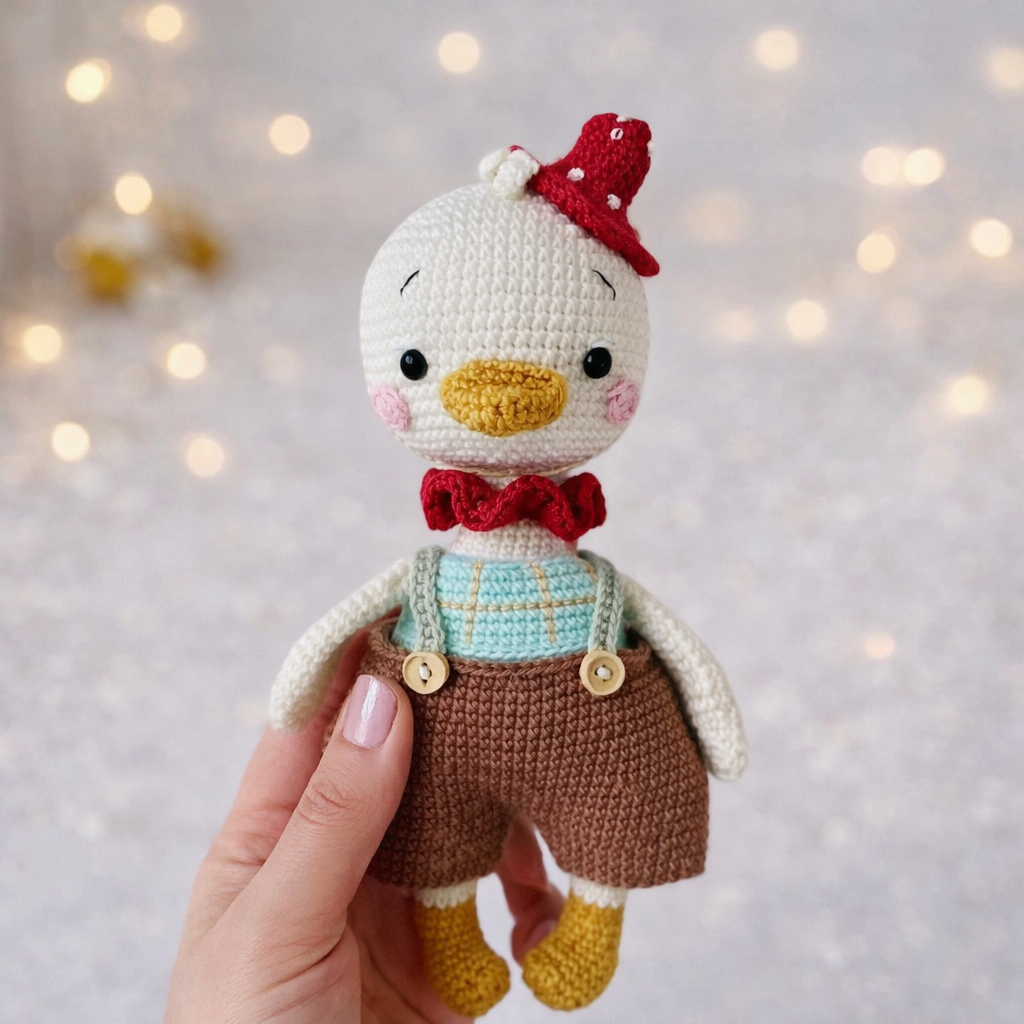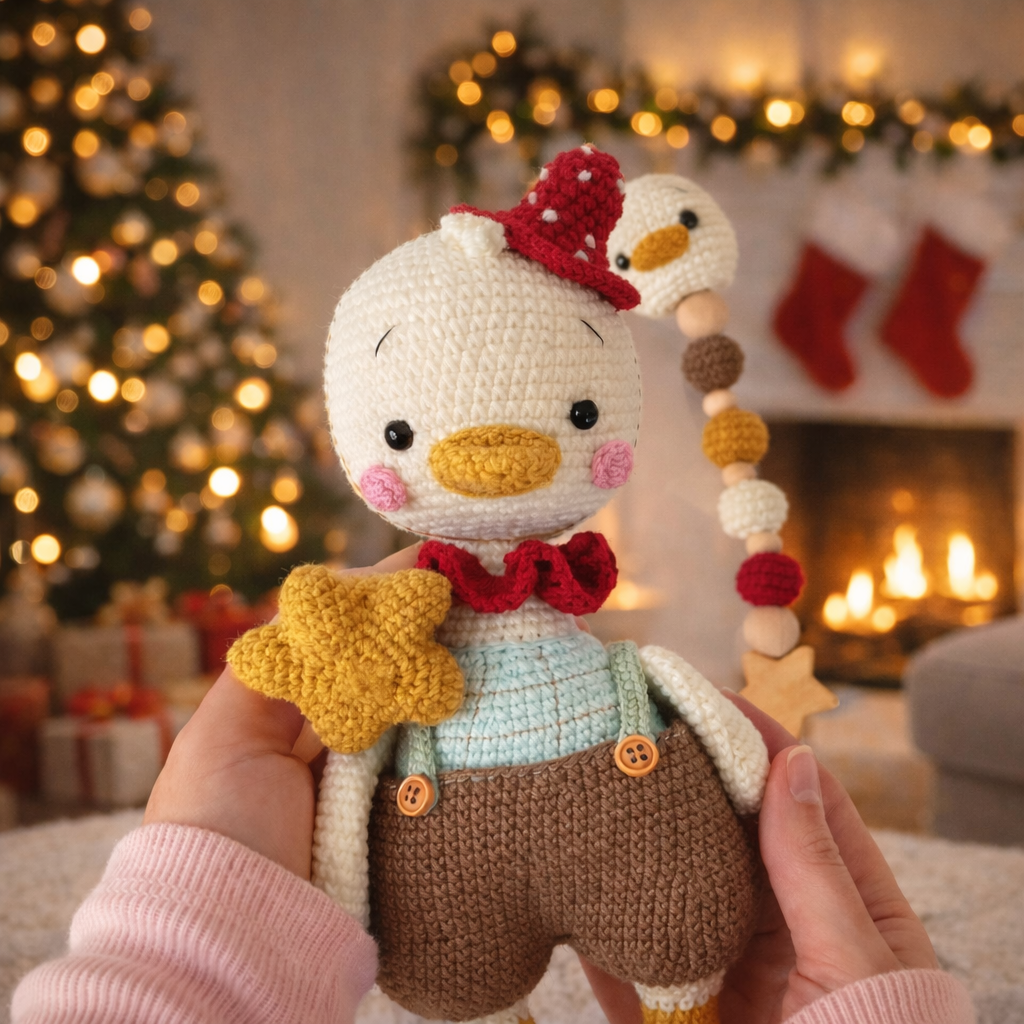 Meet Max the Goose, a dashing gentleman with long legs, a cozy sweater, and a smart cap that makes him stand out. 🌟 With his trousers, frill details, and a shining star accessory, Pol is ready to proudly accompany his beloved Cassie. This crochet pattern will guide you step by step to create a goose full of charm and elegance.